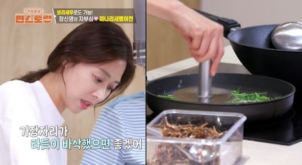 이날 장신영의 친정 엄마는 민물새우의 한 종류인 새뱅이를 꺼냈다. 새뱅이는 과거 장신영 가족이 많이 먹었던 추억의 식재료라고. 장신영의 친정엄마는 얼큰 칼칼한 새뱅이탕, 역대급 밥도둑 새뱅이장을 뚝딱 만들었다. 친정 엄마가 요리할 때 보조셰프로 활약한 장신영은, 이후 메인 셰프로 나서 새뱅이장을 곁들일 수육, 새뱅이튀김, 미나리새뱅이전을 만들었다.