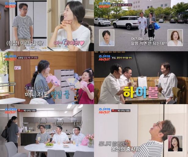 첫 출근길에 동행한 정영림은 방송국 관계자들에게 정성껏 챙긴 선물을 전하며 분위기를 훈훈하게 만들었고 현장에서 "진지한 모습도 멋있다"며 남편에게 애정을 드러냈다. VCR을 지켜보던 황보라는 "매니저랑 팔짱 끼는 건 선 넘은 거다"라며 장난스러운 멘트로 웃음을 자아냈다.
