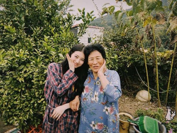 사진 속에서 수지는 촬영장 근처에 있는 외할머니의 집을 찾은 모습. 할머니에게 팔짱을 끼고 꽃받침을 하며 다정하게 사진 찍는 모습이 훈훈함을 자아낸다.