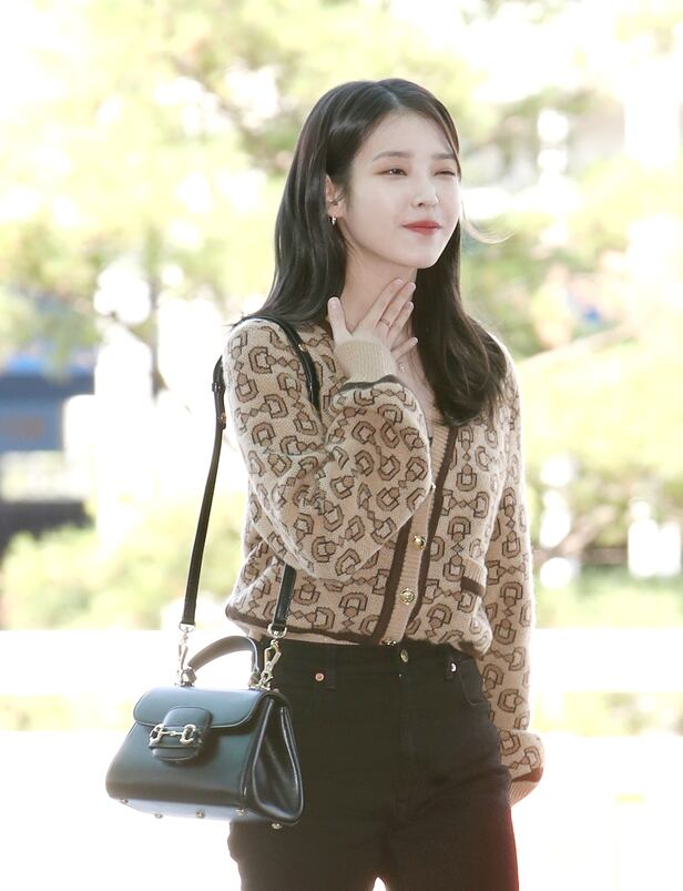 이날 아이유는 카멜색의 카디건에 검은 팬츠를 입고 나타났다. 여기에 검정 크로스백과 앵글부츠를 매치해 고혹적인 가을 여인의 편안한 공항 패션을 선보였다.