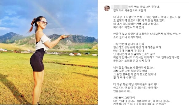 그는 "한동안 잊고 살았는데 조정일이 다가오면서 또 말도 안되는 소리가 들리니 기가 막힌다"라며 "그냥 한번에 끝내줘라 진짜. 인스타고 유투브에 사진 다 내려주길 바래. 당신이 애 키울거 아니자나. 난 다니면서 애들 알아보는것도 싫고 어린이 집에서도 가족사진 내야하고 그로 인해 알아보면 들려오는 소리들 듣고 싶지 않아"라고 주장했다.