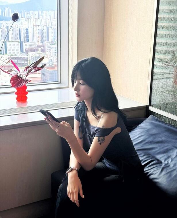 율희는 차콜색 오프숄더 티셔츠에 검은색 바지를 입고 물오른 미모를 뽐냈다. 어깨 부분에 새겨진 커다란 문신도 이목을 끌었다.