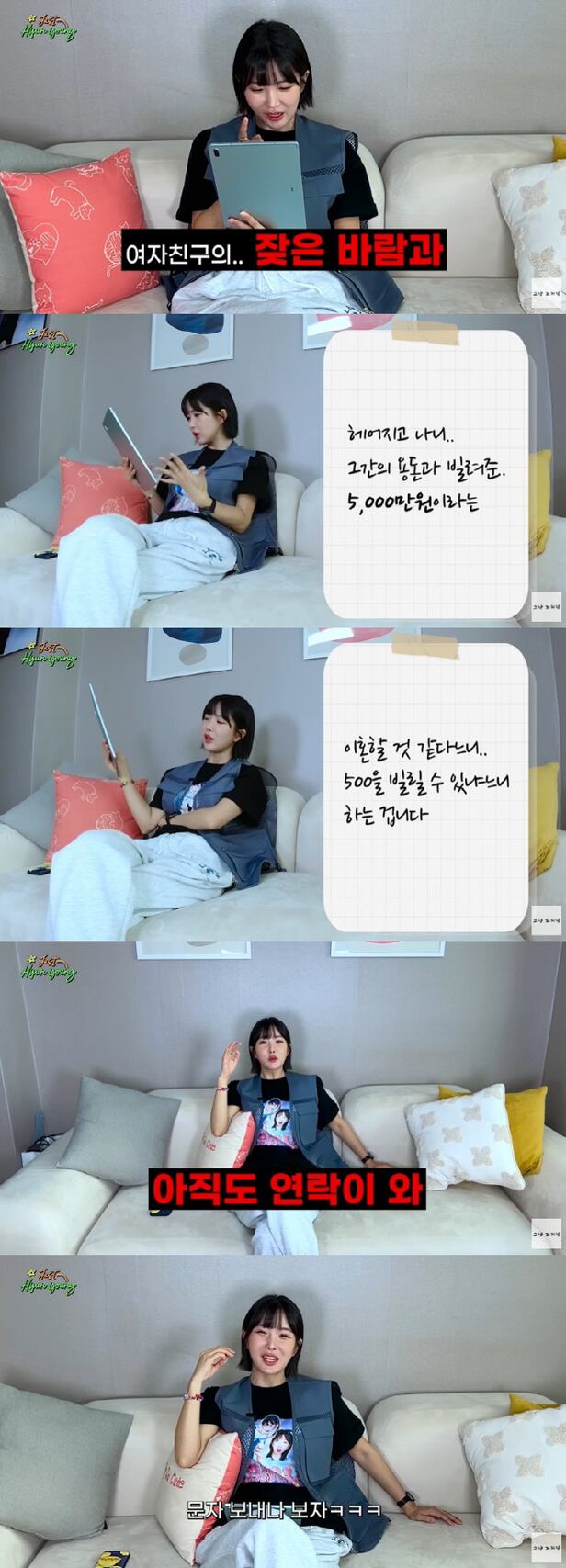 이날 조현영은 자신에게 온 고민들을 해결해주는 콘텐츠를 진행했다. 한 구독자는 "전 여자친구와 교제 1개월 만에 동거를 하게 됐는데 여자친구의 잦은 바람과 금전 요구로 힘든 나날을 보내고 있다. 6개월 간 교제 끝의 4번의 바람 끝에 헤어지게 됐다. 헤어지고 나니 그간의 용돈과 5000만 원이라는 금전적 손해는 너무 아쉽고 분하더라. 하지만 내연남에게 손을 댄 것과 전 여자친구와 내연남의 집을 두드리다가 처벌 받은 일들이 있었음에 금전적인 정리를 하지 않고 연을 끊게 되었고 전 여자친구는 바람 난 남자와 아이가 생겨 결혼했다"고 밝혔다. 이후 전 여자친구에게 연락이 와 돈을 또 빌려달라 했다고. 조현영은 "다시 만나고 싶은 마음은 전혀 없는 거 같다. 이 분은 연애 감정이 없어졌다"며 "그 정이 있었으면 이미 돈을 빌려줬을 거다. 근데 지금 고민은 그게 아니다 지인들과 다 아는 사이인데 지인들에게 안 좋은 소리는 듣게 하고 싶지 않은 것"이라 추측했다.