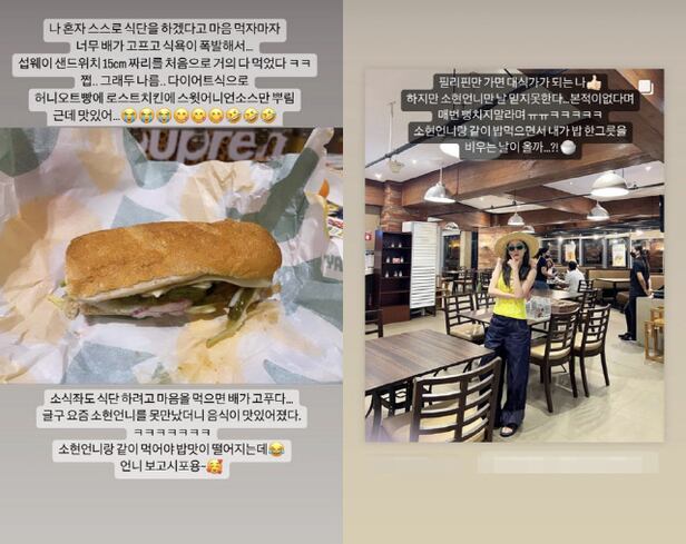 27일 산다라박은 "나 혼자 스스로 식단을 하겠다고 마음먹자마자 너무 배가 고프고 식욕이 폭발해서... 샌드위치 15cm짜리를 처음으로 거의 다 먹었다 ㅋㅋ 쩝.. 그래두 나름.. 다이어트식으로 허니오트빵에 로스트치킨에 스윗어니언소스만 뿌림 근데 맛있어... 소식좌도 식단 하려고 마음을 먹으면 배가 고푸다... 글구 요즘 소현 언니를 못 만났더니 음식이 맛있어졌다. ㅋㅋㅋㅋㅋㅋㅋ 소현 언니랑 같이 먹어야 밥맛이 떨어지는데 언니 보고시포용~"이라며 거대 샌드위치를 순식간에 먹어치운 후기를 전했다.