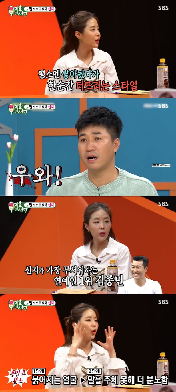 이어 신지는 "일단 얼굴이 굉장히 빨개지고 문장으로 전달이 안 되면 더 화를 낸다. 진짜 화났을 때는 얌전히 있어야 한다. 한 마디 잘못하면 큰일난다"며 김종민이 화내는 과정도 공개, 김종민의 반전 면모를 밝혔다.