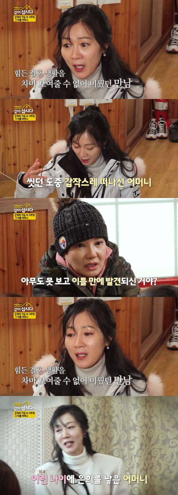 그런가 하면 방은희는 돌아가신 어머니도 떠올리며 눈물을 흘렸다. 방은희는 "사는 게 너무 안 좋아서 엄마가 언제 보냐고 물을 때 늘 다음을 기약해서 1년을 봇봤다. 내 결혼생활을 못 보여주겠더라. 근데 엄마가 돌아가시고 이틀 후에 발견됐다. 샤워하다가 못 일어나신 거다. 아무도 못 봐 이틀 만에 발견된 거였다"라며 눈물을 흘렸다.