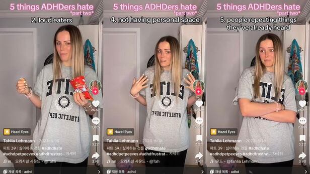 370만 회의 조회수를 획득한 다른 영상에서 틱톡 이용자(@tahlsyywalsyy)는 ADHD 환자는 "느리게 운전하는 사람", "시끄럽게 먹는 사람", "반복적으로 같은 것을 말하는 사람" 등의 6가지를 싫어한다고 말한다.