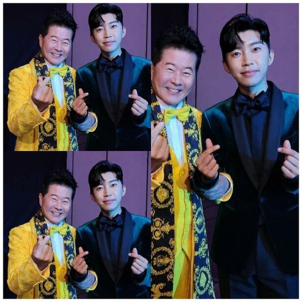 공개된 사진 속 태진아와 임영웅은 깔끔한 시상식 차림과 환한 미소로 손하트 포즈를 취하고 있어 눈길을 끈다. 해당 사진은 트로트 그랑프리쇼 ‘2020 트롯 어워즈’ 무대 오르기 전 촬영한 것으로 두 사람의 돈독한 우정을 느낄 수 있다.
