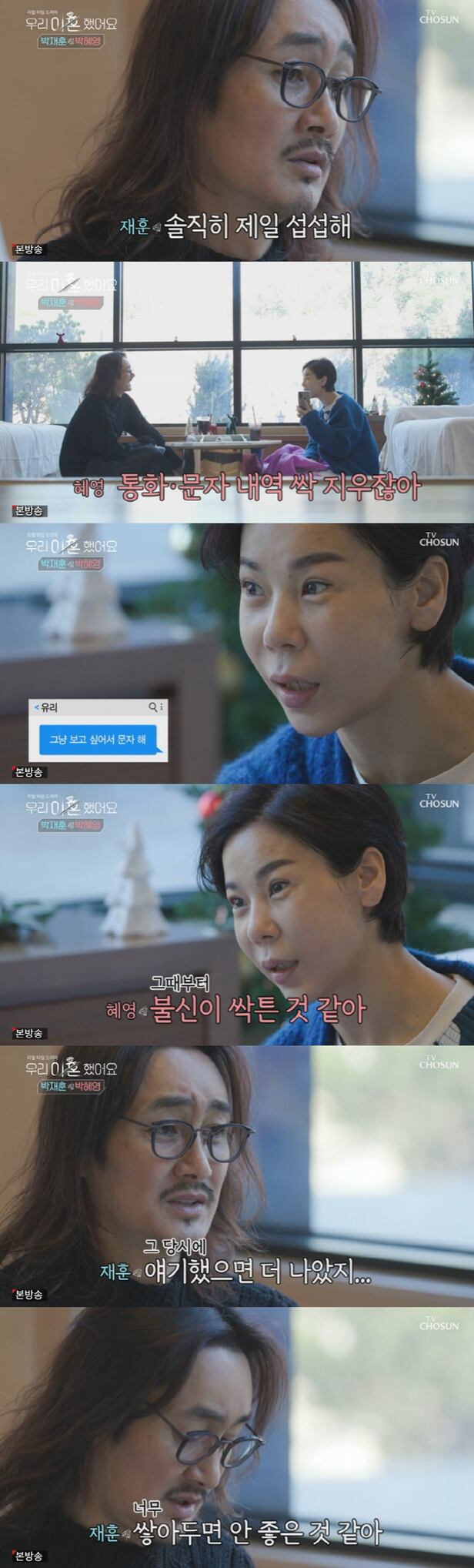 박혜영은 휴대폰 통화 목록부터 문자 내역까지 전부 지우는 박재훈의 습관을 언급하며 "지금도 잊히지가 않는다"고 말했다. 우연히 박재훈이 놓고 간 휴대폰에서 낯선 여자의 이름을 발견했다는 것. 박혜영은 "다 지웠는데 임시 저장이 된 게 있더라. 이름도 기억한다. 유리였다. '그냥 보고 싶어서 문자한다'는 내용이 있었다. 보내려다 못 보낸 거 같은데 그걸 내가 봤다. 기도 안 찼다. 그때부터 (통화 내역 다 지우는 것에 대한) 불신이 싹튼 것 같다"며 "그때부터 계속 내 마음에 쌓아둔 거 같다. 믿음이 없는 거였다"고 털어놨다.