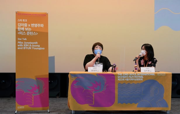 지난 28일 '김아중x변영주와 함께 보는 미스 준틴스 스타 토크'에 참석한 김아중은 변영주 감독과 함께 영화 ‘미스 준틴스’에 대한 관람평을 나누며 관객과 소통했다.
