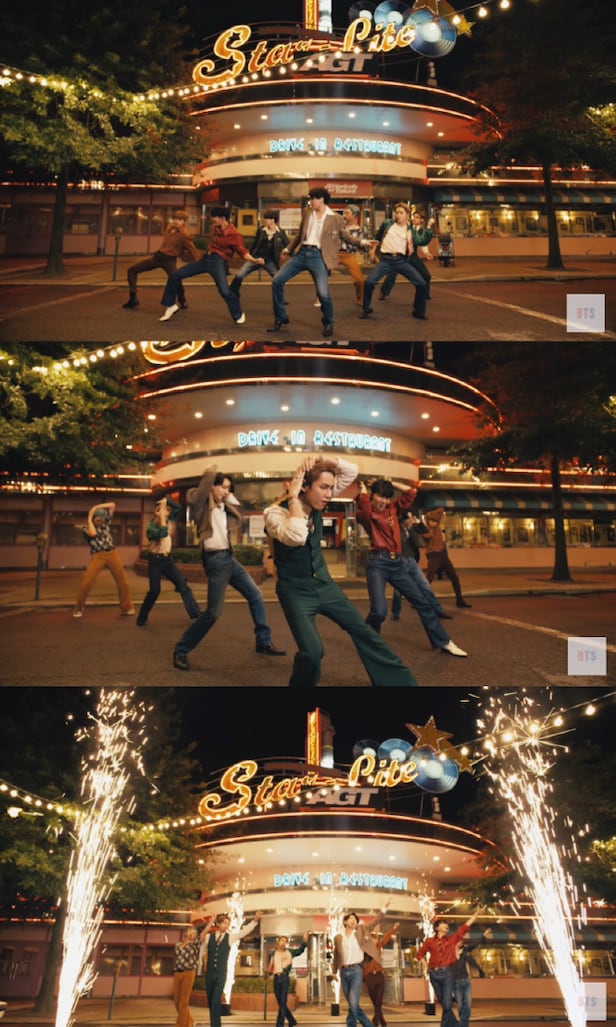 '다이너마이트' '버터' '퍼미션 투 댄스' '쩔어' 'DAN' 등 방탄소년단 히트곡들 뮤직비디오의 공연형 쇼로, 길이 24m·높이 11m 규모의 대형 LED 스크린과 입체 이머시브 음향 시스템을 통해 송출된다. 동시에 매일 48종의 5000여 발의 불꽃놀이와 레이저·스파큘러·메가 CO2 등의 특수효과, 100여 개의 조명 등도 더해진다.