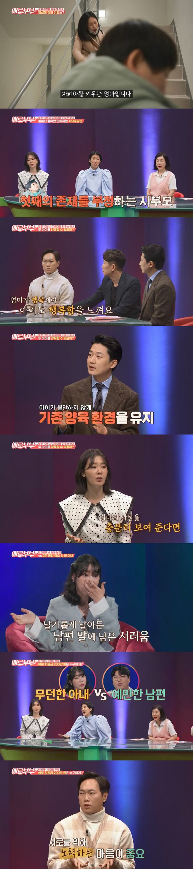 [스포츠조선 정빛 기자] SKY채널과 채널A가 공동 제작하는 본격 19금 부부 토크쇼 '다시 뜨거워지고 싶은 애로부부(이하 애로부부)'가 자폐아동인 아들을 키우며 기댈 곳 하나 없는 아내가 보낸 사연 '애로드라마-주홍글씨'로 시청자들의 눈물샘을 자극했다. 이어 신혼임에도 집안일을 놓고 격돌한 아내와 남편의 '속터뷰'는 공감을 자아냈다.