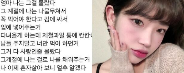 캡처본에는 한 누리꾼이 자신의 SNS에 적은 문구가 담겼다. 그 곳에는 "엄마 나는 그걸 몰랐다. 그 계절에 나는 나물 무쳐서 꼭 먹어야 한다고 김에 싸서 입에 넣어주는거. 다녀올게 하는데 제철과일 통에 칸칸히 채워 남들 주지말고 너만 먹어 하던거. 그거 다 사랑인줄 몰랐다"는 글이 적혀 있다.