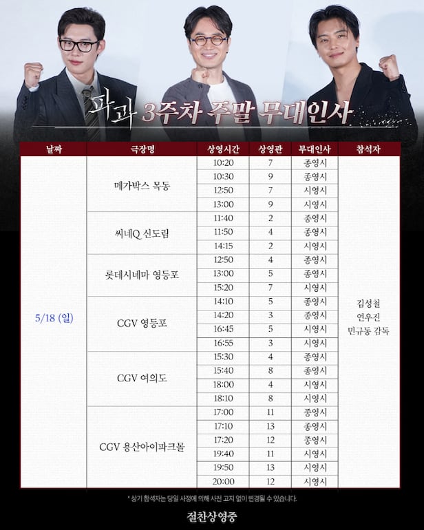 '파과'의 주역들이 개봉 3주차 주말인 5월 18일 무대인사를 통해 관객들을 찾아간다. 김성철, 연우진, 민규동 감독이 참석해 극장을 찾아와준 관객들에게 진심 어린 감사 인사를 전하며 특별한 추억을 쌓을 예정이다. 이번 무대인사는 메가박스 목동, 씨네Q 신도림, 롯데시네마 영등포, CGV 영등포, CGV 여의도, CGV 용산아이파크몰에서 진행된다. 관객들의 뜨거운 성원에 보답하기 위해 개봉 3주차 무대인사까지 확정한 영화 '파과'의 무대인사 예매와 자세한 사항은 극장별 홈페이지 및 애플리케이션을 통해 확인할 수 있다.