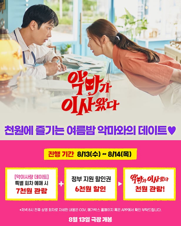 이번 프로모션은 커플 관객들 사이 만족도가 높은 영화의 특색을 살려, 극장 데이트 프로모션으로 기획됐다. 특히 정부지원 국민 영화관람 6천원 할인권까지 중복 적용하면 1천원에도 영화 관람이 가능해, 무더운 여름 극장을 데이트 코스로 선택하고 있는 학생, 직장인 등 관객들에게 '악마가 이사왔다'의 파격적인 할인 프로모션이 큰 호응을 얻을 것으로 보인다. '악이사랑 데이트' 프로모션은 CGV, 메가박스 극장 APP 및 CJ ENM 공식 SNS를 통해 자세한 내용을 확인할 수 있다.