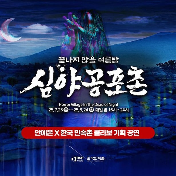 한편, 한국 민속촌의 공포 축제 '심야공포촌'은 이달 24일까지 오후 4시부터 자정까지 매일 운영되며, 안예은과 한국 민속촌이 함께하는 컬래버레이션 공연은 오는 14일 오후 8시 한국 민속촌에서 진행된다.