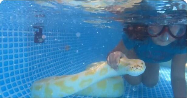 외신에 따르면, 이스라엘 남부 지역에 살고 있는 인바(8)는 집 뒷마당에 있는 작은 수영장에서 애완용 비단뱀과 수영하는 것을 즐긴다.