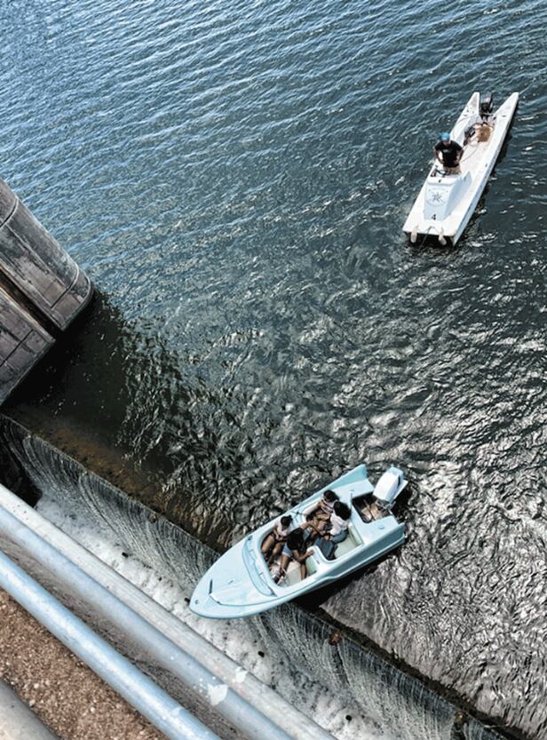 미국 텍사스주 오스틴의 레이디버드 호수에서 지난 10일(현지 시각) 여성 4명이 타고 있던 전동 보트(아래)가 급류에 휩쓸려 댐 아래로 떨어질 위기에 처하자 인근에 있던 보트 대여 업체 직원(위)이 보트에 밧줄을 걸어 추락을 막고 있다. 신고를 받고 현장에 도착해 여성들을 구조한 구조팀은 “보트에 타고 있던 여성들이 수다를 떠느라 댐 가까이 간 줄 몰라 일어난 일”이라며 “근처에 보트 대여 업체 직원이 없었다면 위험했다”고 전했다.