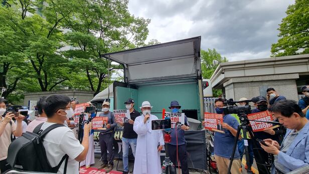 이날 방송차량에서 노래 등이 큰 소리로 나오고, 북과 꽹과리 소리가 이어지며 주변 시민들의 불편이 컸다. 집회 현장 인근을 지나가던 아크로비스타 주민 박선영(41)씨는 “오늘부터 집회한다고는 들었는데 너무 시끄러워 불편하다”며 “청와대나 (대통령) 집무실 앞도 아닌데, 굳이 여기서 집회해야하나 싶다”고 했다.