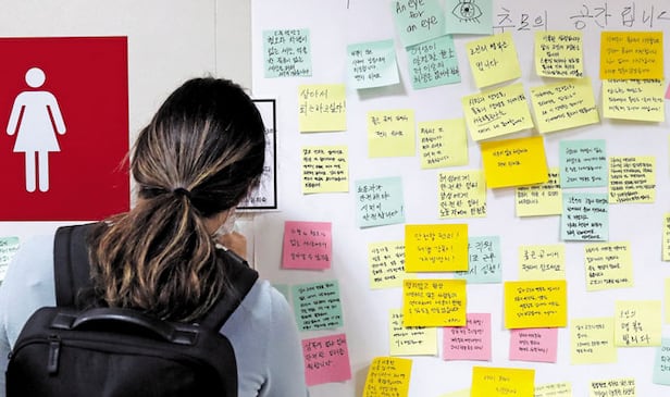 16일 오후 서울 2호선 신당역 여자 화장실 앞. ‘바뀌지 않는 시대에 남성으로서 죄송합니다. 편히 쉬세요’ ‘이래도 스토킹이 실체가 없고 경미한가요’ ‘부디 안전하고 존중받는 곳에서 행복하시기를, 같은 여자로서 간절히 바랍니다’ 등 시민들의 안타까운 마음을 담은 메모가 노랑, 분홍 등 색색의 포스트잇에 적혀 빼곡하게 붙어 있었다. ‘강남역 이후 아무것도 변하지 않았다’ ‘살아서 퇴근하고 싶다’ 등의 한탄의 글을 쓴 사람도 많았다. 그 옆에 놓인 테이블에는 국화 꽃다발 50여 개가 소복이 쌓여있었다.