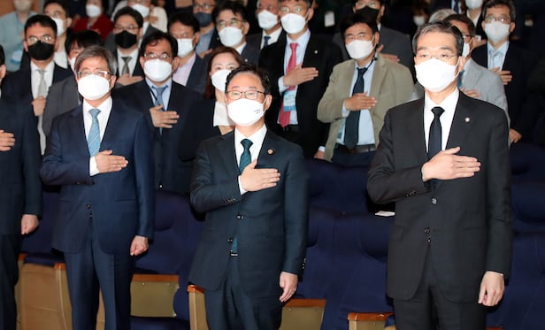 여야가 ‘검수완박(검찰 수사권 완전 박탈)’ 중재안에 대해 협의하며 법조계 반발이 거세지는 가운데 25일 ‘법의 날’ 기념식에 참석한 법조계 수장들의 발언이 주목받고 있다.