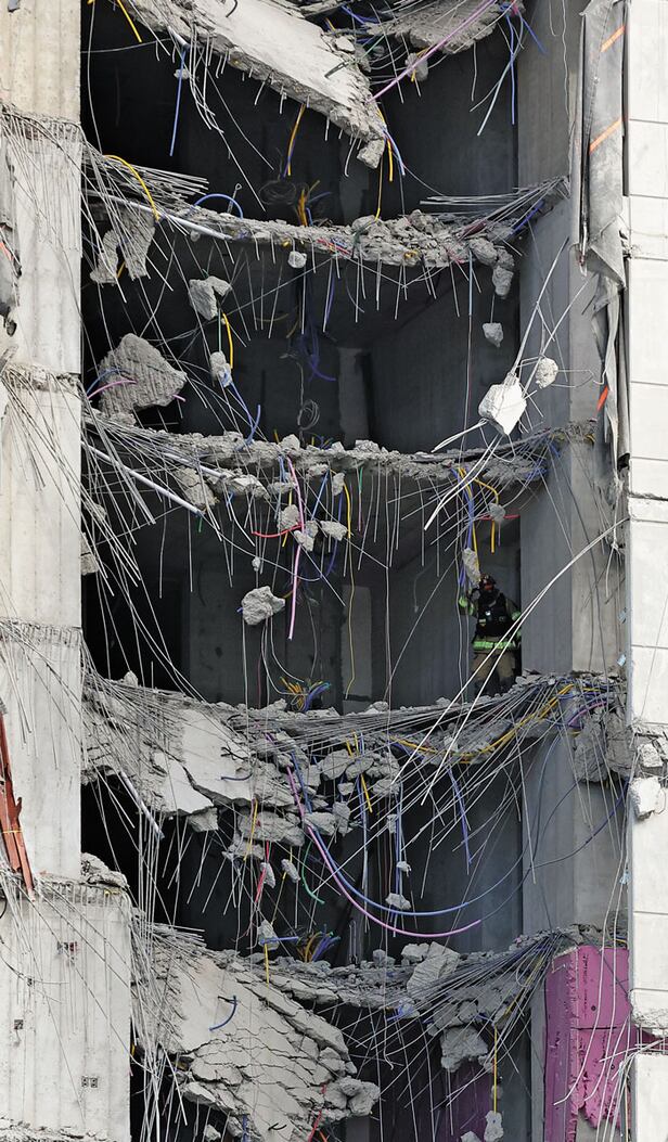 콘크리트 낙하물도 수색 대원을 위협하고 있다. 15·16일 이틀 동안 아파트 고층부에서 성인 주먹만 한 콘크리트 구조물 파편이 9차례나 지상으로 떨어져 수색 작업이 중단됐다. 구조 당국은 작업 도중 작은 낙하물에도 사이렌으로 비상 상황을 전파하고 있다. 구조 당국은 이날 구조대원 209명과 장비 47대를 투입하고, 무인굴착기 등을 동원해 지상 1층에 쌓인 일부 잔해물을 제거했다. 문희준 광주서부소방서장은 “타워크레인 해체만 되면 붕괴된 23~38층에 대한 정밀 탐색을 실시할 예정”이라고 했다.