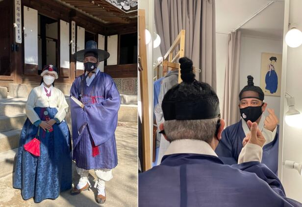 사진 속엔 한복 차림의 코르소 대사 대리 모습이 담겼다. 갓과 두루마기를 갖춰 입고 조선시대 양반 모습을 완벽히 재현해냈다. 그의 옆엔 한복 인플루언서 유미나씨가 한복 차림에 털 달린 조바위를 쓰고 나란히 서 있다.