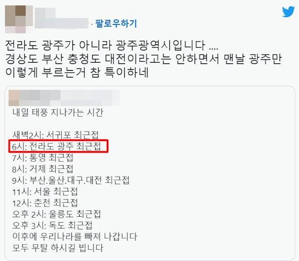시작은 전날(5일) 한 트위터 이용자가 올린 태풍 이동 경로 트윗이었다. 이 이용자는 “내일 태풍 지나는 시간”이라며 오전 6시 ‘전라도 광주’에 최근접한다는 내용을 적었다. 오전 9시쯤 ‘부산, 울산, 대구, 대전’ 등에 최근접한단 내용도 포함됐다.