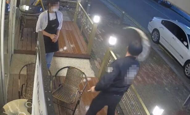 지난 6일 오후 8시쯤 촬영된 CCTV 영상을 보면 직원이 담배를 피우는 손님들에게 다가가 말을 걸자 갑자기 한 중년 남성이 테이블에 커피를 쏟아버린다. 이후 함께 있던 다른 남성은 직원과 대화를 나누다 커피가 담긴 유리잔을 도로에 던져 버린다.