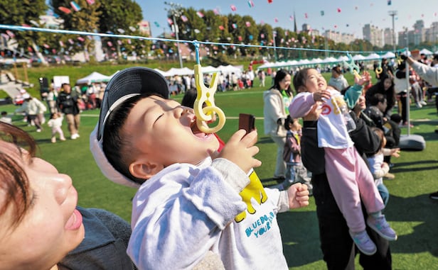 4일 서울 송파구 잠실유수지공원에서 ‘2025 송파 어린이집 대잔치’가 열렸다. 송파구의 어린이집 아이들과 학부모, 선생님 등 3600여 명이 모여 가을 운동회를 즐겼다. 아이들이 엄마·아빠와 줄에 매달린 과자를 손 안 대고 먹는 게임을 하고 있다.