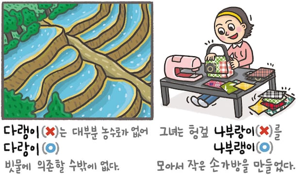이 글에서 ‘다랭이’의 표준말은 ‘다랑이’입니다. ‘다랑이’는 산골짜기의 비탈진 곳 등에 있는 좁고 긴 계단식 논배미(논두렁으로 둘러싸인 논의 구역)를 뜻해요. ‘다랑논’ ‘논다랑이’라고도 하죠. ‘다랭이’는 ‘다랑이’의 방언이랍니다. 참고로 ‘다랭이 마을’은 다랑이 논이 많은 데서 붙인 이름인데, 구수한 사투리 발음을 살려 ‘다랑이 마을’이 아닌 ‘다랭이 마을’로 통용하고 있어요. 하지만 그 어원은 ‘다랑이’라는 것을 알아두세요.