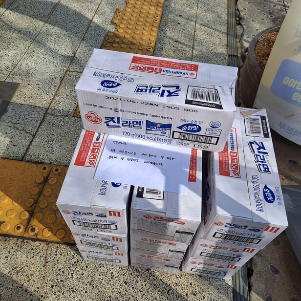지난 15일 인천 부평구 삼산1동 행정복지센터 앞에 라면 열 상자와 이런 내용을 담은 손편지가 놓여 있었다. 이 라면 등을 들고 온 이는 30대 남성이었다. 이 남성은 지난해 11월에도 이름을 밝히지 않은 채 라면 다섯 상자를 기탁했다.