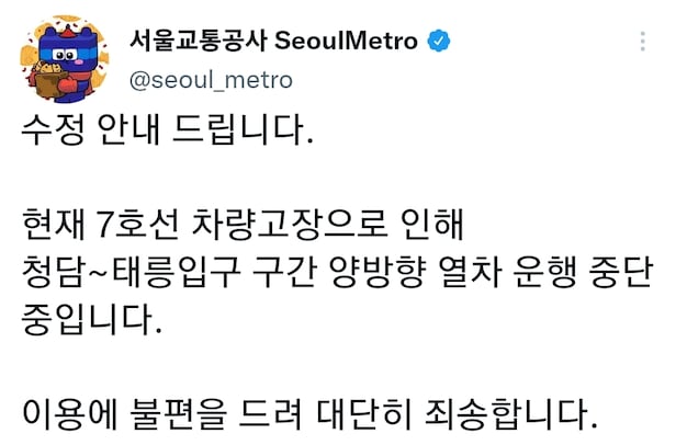 열차 고장으로 현재 7호선 청담역~태릉입구역 구간 열차 운행이 양방향 통제되고 있다.