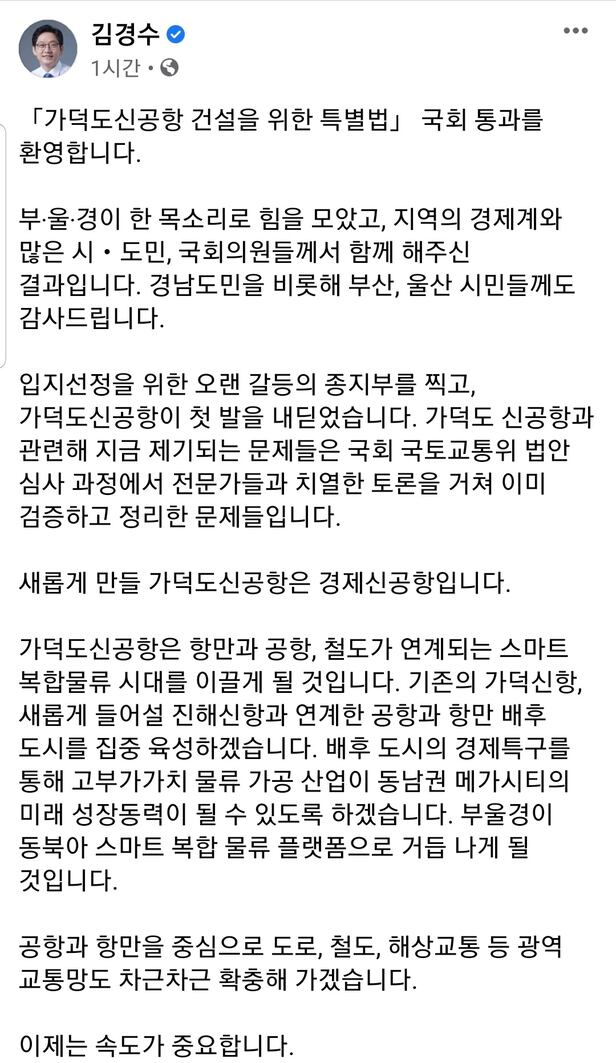 김 지사는 “가덕도 신공항에 대해 제기되는 문제는 국회 국토교통위 법안 심사 과정에서 전문가와 치열한 토론을 거쳐 이미 검증하고 정리한 문제다”며 더 이상의 논란을 일축했다.