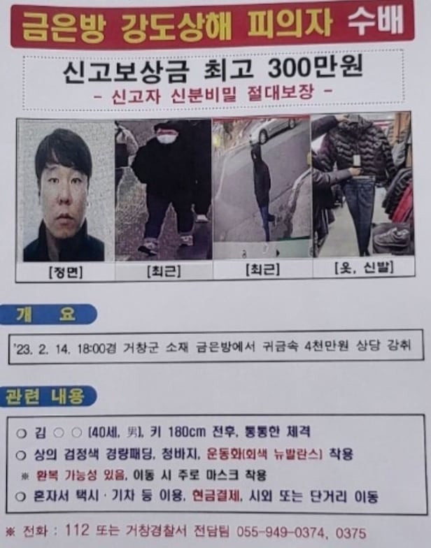 김씨는 지난 2월 14일 오후 6시쯤 경남 거창군 한 금은방에서 미리 준비한 흉기로 주인 부부를 위협하고 진열대에 있던 4000만원 상당(피해자 측 주장) 귀금속을 빼앗아 달아난 혐의를 받는다.