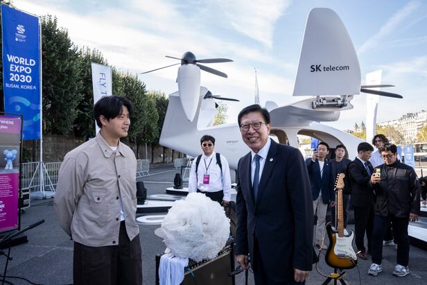 10일 프랑스 파리 에펠탑 앞 센강 파토무슈 페리선착장의 선상카페 ‘구스타프’에 이 글귀가 적힌 현수막이 내걸렸다. 이 선착장, 선상카페 갑판엔 ‘BUSAN’ ‘GOOD’ 등이 쓰인 부산 출신 임지빈 작가의 파랑·분홍색 ‘베어벌룬’이 방문객들을 맞았다. 선착장 한켠에 놓여진 UAM(Urban Air Mobility, 도심형 항공교통) 모형에선 부산항 북항 위를 날며 풍광을 감상하는 가상현실 체험 서비스를 했다.