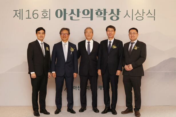 21일 오후 서울 웨스틴조선호텔에서 열린 제16회 아산의학상 시상식에서 정몽준(가운데) 아산사회복지재단 이사장과 수상자들이 시상 후 기념 촬영을 하고 있다. 왼쪽부터 젊은의학자부문 박세훈 서울대병원 신장내과 교수, 임상의학부문 강윤구 서울아산병원 종양내과 교수, 정 이사장, 기초의학부문 전장수 광주과학기술원 생명과학부 교수, 젊은의학자부문 정충원 서울대 생명과학부 교수.
