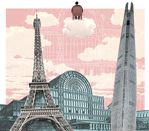이처럼 수정궁과 에펠탑은 시민사회를 완성한 건축물이다. 빠르게 경제성장과 민주화를 이룬 우리나라의 경우에는 흥미롭게도 수정궁과 에펠탑이 한곳에 지어져 있다. 바로 잠실 롯데월드 단지다. 1989년에 완성된 롯데월드는 수정궁같이 자연 채광이 되는 거대한 실내 공간 안에 위락 시설을 갖추었다. 사람들은 야외 공간 같은 실내 공간에서 소비자가 된다. 2016년에는 롯데월드타워가 완성되었다. 높이 555m의 월드타워는 꼭대기에 전망대가 있다. 남산 높이까지 포함해서 479m인 서울남산타워보다도 높다. 이제는 북한산을 등산하지 않고도 롯데월드타워의 엘리베이터를 타고 편하게 올라가 서울을 내려다볼 수 있게 되었다. 서울의 어떤 펜트하우스보다도 높은 이곳 전망대에서 일반 시민은 최고 권력자의 시선을 가질 수 있다. 롯데월드와 롯데월드타워는 대한민국의 수정궁과 에펠탑이라 할 수 있다.