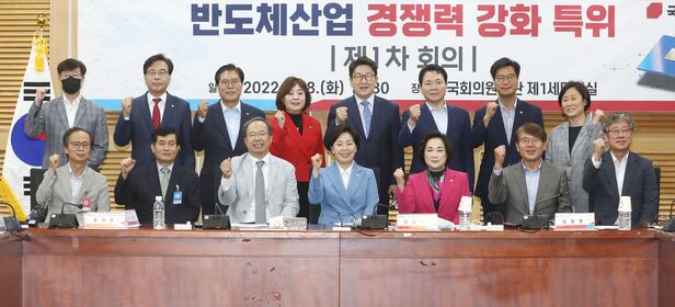 민주당 출신 무소속인 양 의원은 지난 4월 ‘검수완박(검찰 수사권 완전 박탈)’ 법안을 공개 비판하면서 민주당 주류 인사들과는 다른 목소리를 냈다. 그래선지 이날 회의에 참석한 국민의힘 의원들은 양 의원에게 먼저 반갑게 악수를 청하는 이들이 많았다. 양 의원을 사이에 두고 권성동 국민의힘 원내대표와 성일종 정책위의장 등 지도부가 둘러앉았다. 권 원내대표는 “천군만마를 얻은 느낌”이라고 했다. 국민의힘은 향후 ‘반도체 특위’에 민주당 의원들도 포함시켜 초당적 기구로 만들겠다는 구상이다.