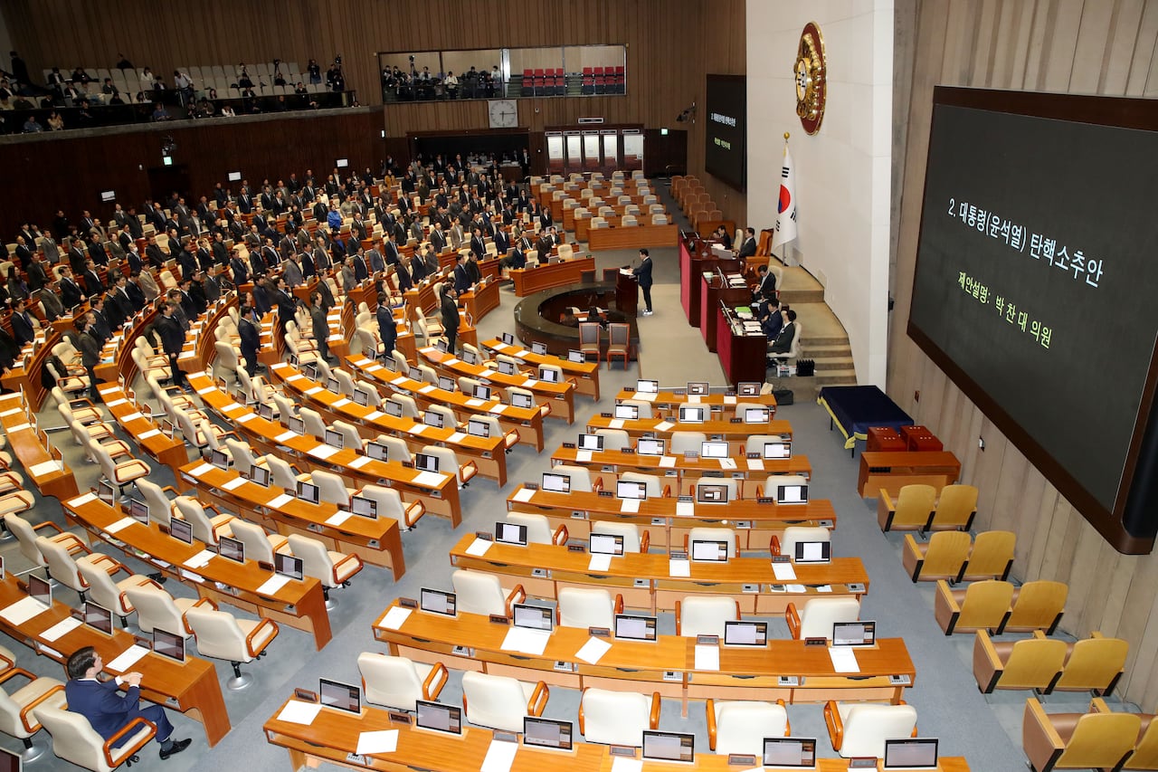 국민의힘은 본회의 직전 열린 의원총회에서 윤 대통령 탄핵안, 김건희 여사 특검법 반대를 당론으로 정했다. 대통령 탄핵안 상정에 앞서 국민의힘 의원들이 본회의장에서 일제히 퇴장하자, 우원식 의장은 “돌아오라”며 투표 종료 선언을 보류했다. 이로 인해 본회의가 개의한 지 4시간 넘도록 탄핵안에 대한 결론이 나오지 못했다. 이날 밤 9시 20분쯤 우 의장은 대통령 탄핵안이 부결된 사실을 알리며 “국민께 죄송하다”고 했다.