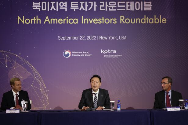 윤석열 대통령이 22일(현지시각) 미국 뉴욕에서 열린 ‘북미지역 투자신고식 및 투자가 라운드테이블’에 참석해 현지 글로벌 기업들로부터 총 11억5000만달러(약 1조6169억원)의 투자를 약정받았다고 밝혔다. 대부분 윤석열 정부가 중점 육성하려는 반도체, 전기차, 이차전지 등 첨단산업 분야 기업들이다. 생산시설 증설과 함께 연구개발(R&D) 센터 신설 등에 투자를 약정한 것으로 알려졌다.