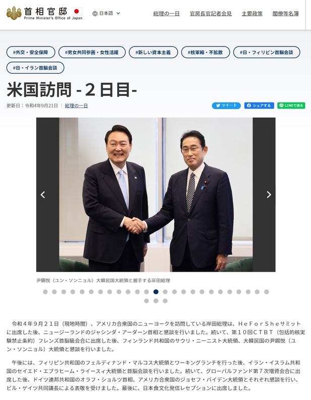 국회 외교통일위원회 소속인 더불어민주당 김경협 의원(경기 부천시갑)은 2일 “일본 총리실 공식 홈페이지 영문판의 ‘외교관계’란을 확인한 결과 한·일 회담 관련 기록을 찾아볼 수 없었다”고 했다. “(일본 측에서) 총리실 영문 홈페이지에 뉴욕 방문 당시 일정 7개를 기록하면서 윤 대통령과 만난 사실은 기록조차 하지 않았다”는 것이다. 한겨레는 이날 오전 11시45분 이같은 김 의원 주장을 바탕으로 <[단독] 日 총리실 누리집에 ‘한-일 정상 약식회담’은 없었다>는 제목의 기사를 내보냈다.
