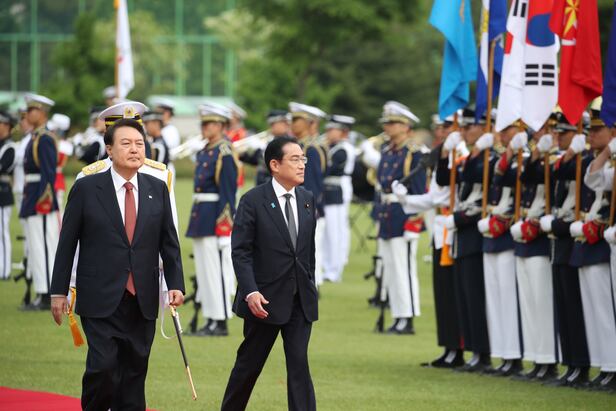 한일 정상은 잔디마당으로 내려와 국군 의장대를 사열했다. 이어 양국 주요 참모들과 악수하고 대통령실 청사로 입장했다.