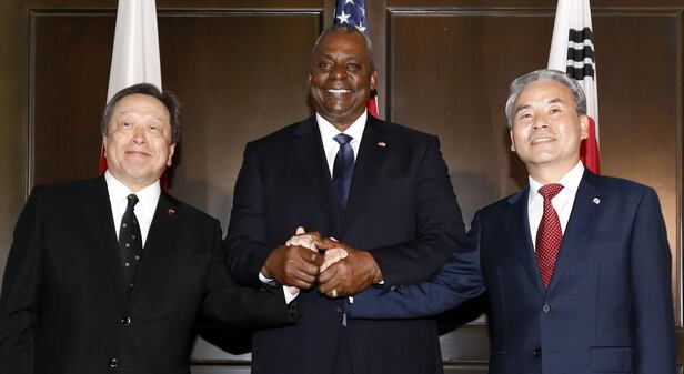이종섭 국방장관은 회담 뒤 기자들과 만나 “북한 미사일에 대한 경고 정보 실시간 공유를 위해 현재 한미 간, 그리고 미일 간 운영 중에 있는 정보 공유체계를 서로 연동시키기로 했다”고 말했다.