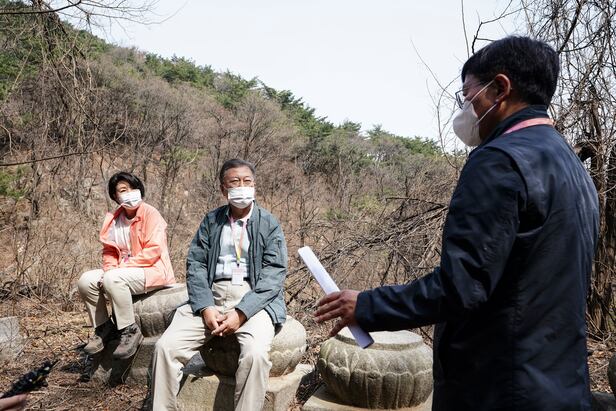 문 대통령 부부는 지난 5일 청와대 뒤편 서울 북악산 남측 탐방로 개방을 기념한 산행을 하면서 법흥사로 추정되는 절터에 도착해 연화문 초석에 앉아 동행한 김현모 문화재청장과 법흥사에 관한 얘기를 나눴다.