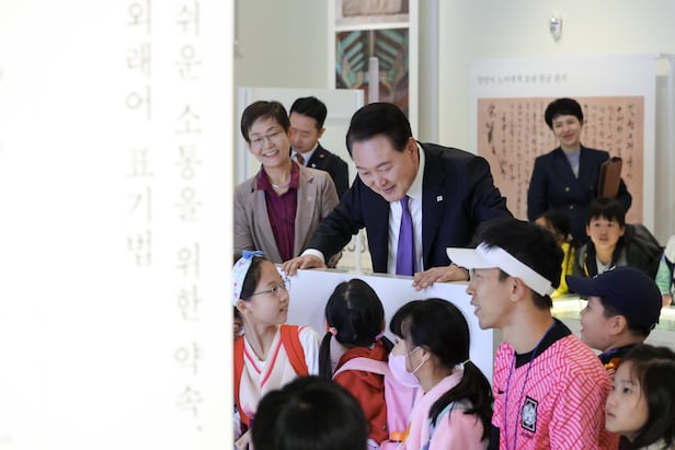 윤 대통령은 디지털 전시실에서 관람 중인 서울 강동구 꿈미학교 3학년 학생들에게 “한글 공부 열심히 하라”고 격려했다.