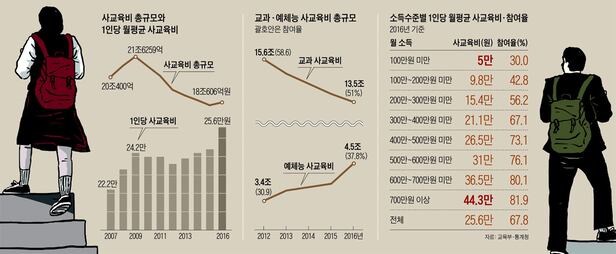 정부가 사교육비를 줄이기 위해 운영하는 방과 후 학교가 제대로 효과를 발휘하지 못한다는 지적도 나온다. 방과 후 학교 참여율은 2009년 이후 꾸준히 증가했지만 2013년 60.2%에서 정점을 찍고 지난해 55.8%까지 줄었다. 김희규 신라대 교육학과 교수는 "학교 방과 후 수업에서 교과뿐 아니라 특기·적성 교육을 강화하는 등 국가와 지자체가 나서 저소득층 학생들의 질 높은 비교과 활동 참여 기회를 늘려줘야 한다"고 말했다.