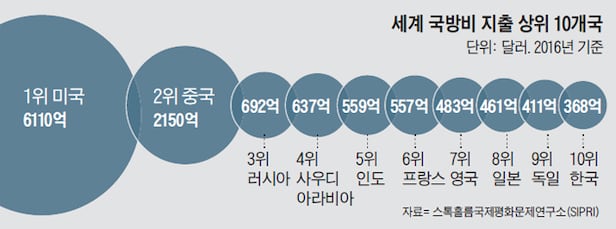 스톡홀름국제평화문제연구소(SIPRI)에 따르면 지난 2016년 기준 미국이 지출한 국방비 6110억달러는 중국·러시아·사우디 등 나머지 2위에서 9위까지를 합한 국방비(5950억달러)보다 많다. 특히 미국의 국방비는 국내총생산(GDP) 대비 4% 안팎으로 1~2% 수준인 다른 선진국을 월등히 뛰어넘는다. 한국의 GDP 대비 국방비 비율은 2.4% 정도다.