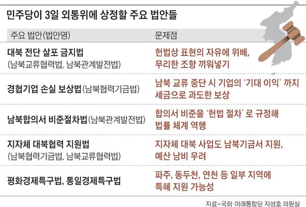 더불어민주당이 3일 외교통일위원회 전체회의에 상정·처리할 것으로 알려진 대북 전단 살포 금지법 등 남북 협력 법안 18건은 2일 현재 법안소위원회 회부·의결 등 기본 절차조차 거치지 않은 상태다. 민주당은 특정 접경 지역에 '평화 경제 특구'를 설치해 지원하고, 남북 경협 기업의 미실현 기대 이익까지 '손실'로 간주해 세금으로 보상해주는 법안도 통과시킬 방침으로 전해졌다. 외통위 관계자는 "민주당이 176석의 힘을 바탕으로 각종 위헌·위법 논란이 있는 법안까지 밀어붙이려는 것"이라고 했다.