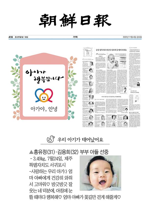 조선일보에 실린 우리 아기 출생 소식, 본인이나 지인의 인터뷰·사진 기사를 영원히 추억으로 간직하세요. 조선일보는 독자가 원하는 신문 지면을 그대로 고급 액자에 담아 드리는 ‘조선일보 리프린트’ 서비스를 시작했습니다. 매주 ‘아이가 행복입니다’ 지면에 소개된 한 가족을 추첨해 리프린트를 선물로 드립니다. 지난 11월 4일 ‘우리 아기가 태어났어요’ 지면에 실린 홍유정·김용희씨 부부 아들 선중이<사진>가 이번 주 주인공입니다. 자세한 내용은 홈페이지(reprint.chosun.com)에서 확인할 수 있습니다.